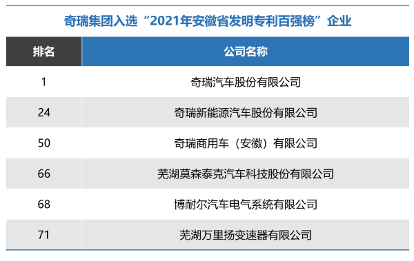 奇瑞的专利数量足以说明它对技术的执着,2022年2月7日,由安徽省市场监督管理局、安徽省教育厅、安徽省经济和信息化厅联合发布的“2021年安徽省发明专利百强榜”中,奇瑞排名第一,而这已是奇瑞占据该榜单榜首的第八个年头。