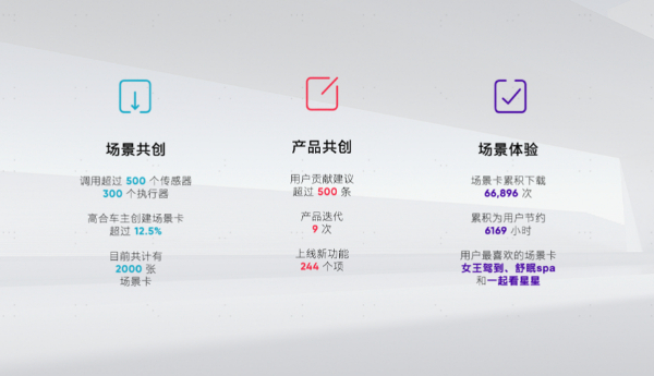 从2021年5月8日正式交付以来,高合与用户⼀起创造了超过2000张场景卡。通过用户贡献的超500条建议,迭代了244项功能。目前,场景卡已有超过6万次的下载使⽤量,可为用户累计节约超过6千小时操作时间。共创的场景卡覆盖自驾出游、露营、日常通勤、亲子出游、节日庆典等多个场景,车内外的科技智能,正在不断被用户发掘和提升。