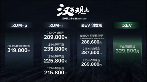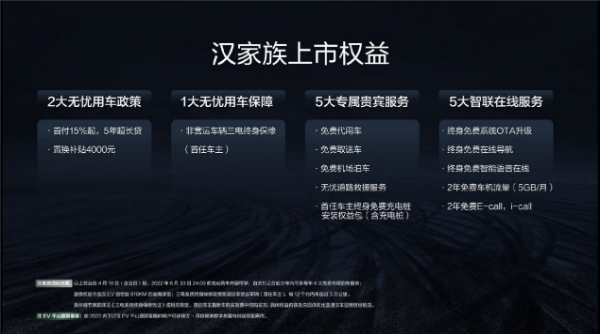 4月10日,汉家族4款车型全新上市,综合补贴后售价区间为21.58万元-32.98万元,同时为用户准备了2大无忧购车政策、1大无忧用车保障、5大专属贵宾服务、5大智联在线服务等多重购车礼遇。