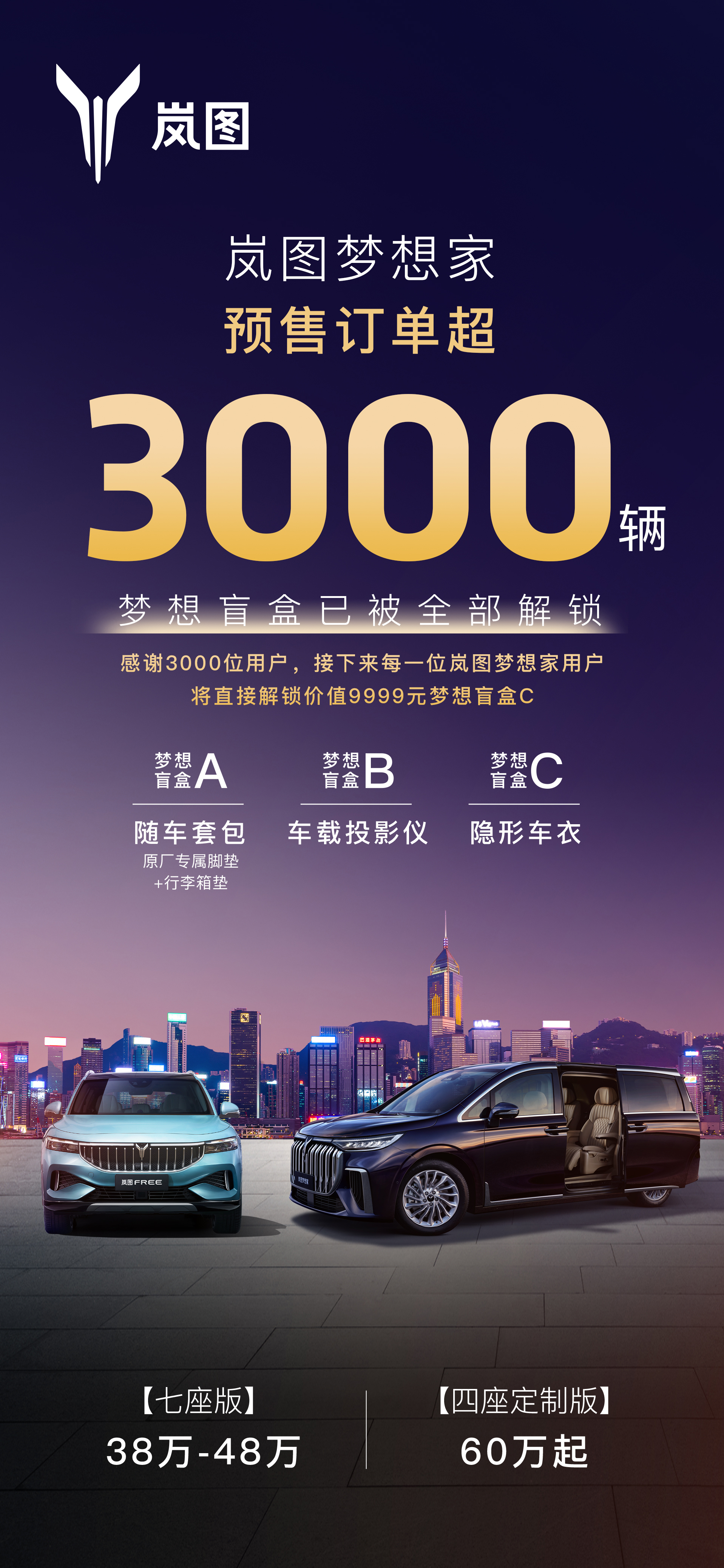 梦想家是岚图汽车推出的第二款具有里程碑意义的战略车型,是采用双动力布局的率先开创电动豪华MPV新品类。岚图梦想家具备舒适空间、舒享豪华、温暖科技、全域安全等优势,同时提供四座定制版和七座版,宜商宜家。岚图梦想家七座版预售价为38万元-48万元,四座定制版预售60万元起。相较于传统MPV,岚图梦想家配备带魔毯功能的空气悬架和CDC及高通8155芯片等智能科技配置,将成为MPV用户的新选择。