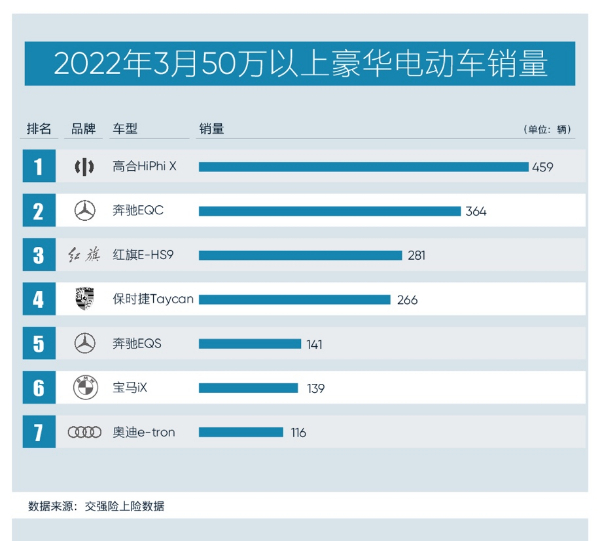2022年3月,成交均价近70万元的中国豪华纯电汽车高合HiPhiX以459辆的成绩,连续四个月占据50万以上豪华纯电市场销量榜冠军。同时,合计以1364辆的成绩成为该细分市场第一季度销量总冠军,季度市占率高达28%,进一步巩固其在细分市场的领先地位。