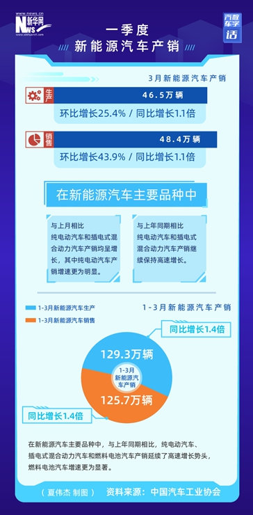 中汽协数据显示,今年以来新能源汽车产销表现明显好于行业,3月,新能源汽车产销分别达到46.5万辆和48.4万辆,环比增长25.4%和43.9%,同比增长均为1.1倍。1-3月,新能源汽车产销129.3万辆和125.7万辆,同比增长均为1.4倍,市场占有率达到19.3%。