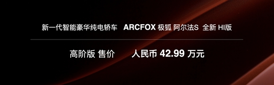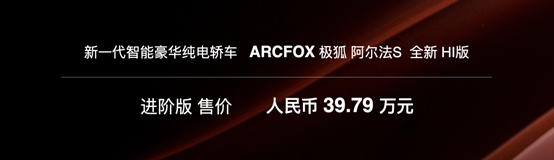 狐阿尔法S全新HI版,搭载HI华为全栈智能汽车解决方案、支持城市道路高阶智能驾驶、搭载华为智能座舱-鸿蒙车机OS。新车分为进阶版和高阶版两个版本,进阶版售价39.79万元,高阶版售价42.99万元。