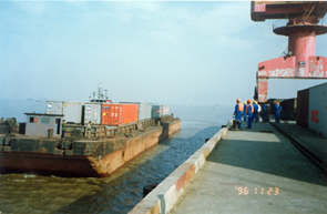 图为1996年11月23日,进口的二手发动机缸盖线设备运至芜湖朱家桥码头