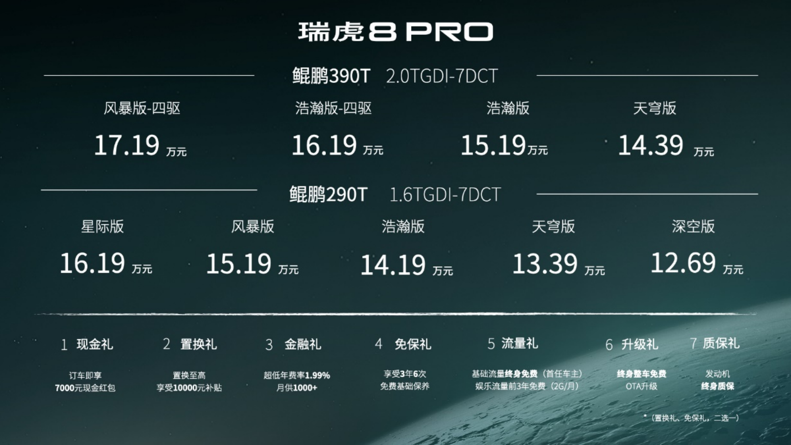 奇瑞汽车秉承以用户为中心的理念,在瑞虎8 PRO上市之际,为下订用户带来“全域豪礼”7重奏,包括①现金礼:订车即享7000元现金红包;②置换礼:置换至高享受10000元补贴;③金融礼:超低年费率1.99%,月供1000+;④免保礼:享受3年6次免费基础保养;⑤流量礼:基础流量终身免费(首任车主)、娱乐流量前3年免费(2G/月);⑥升级礼:终身整车免费OTA升级;⑦质保礼:发动机终身质保等7重豪礼。(注:置换礼、免保礼二选一)