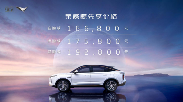 荣威鲸主打智能科技,共有白鲸版、虎鲸版、蓝鲸版三大车型,先享价分别为16.68万元、17.58万元、19.28万元;荣威龙猫针对职场独立女性,提供跃动龙龙版和灵动猫猫版两款车型,先享价分别为12.58万元和12.98万元。