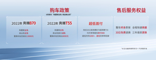 其中,2022款奔腾B70可享购置税全免、商业险全免,置换补贴至达13000元。2022款奔腾T55可享购置税全免、商业险部分减免,置换补贴至达8000元。同时,两款产品均可享受超低首付888、超低月供1000+、超低利率。此外,用户购车均可享售后服务权益,包含整车终身质保、30日免费退换、全程快速救援、三年易损更换等。