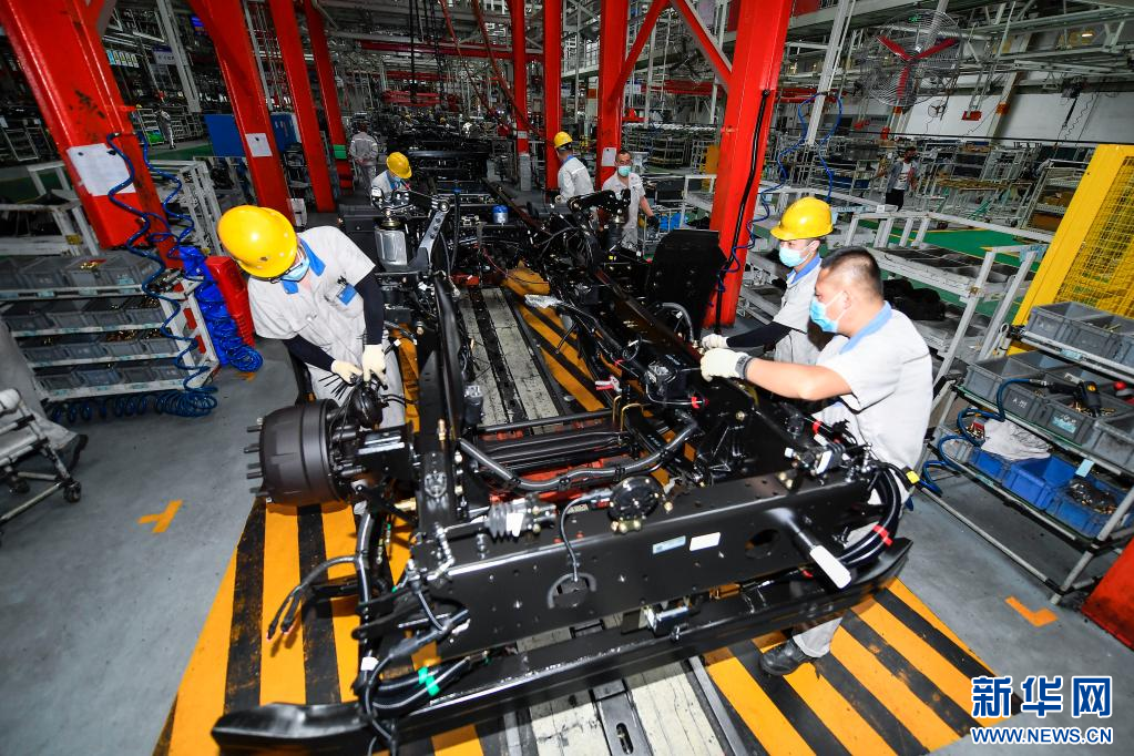 6月15日,工人在位于吉林长春的一汽解放总装车间内装配车辆。新华社记者 许畅 摄