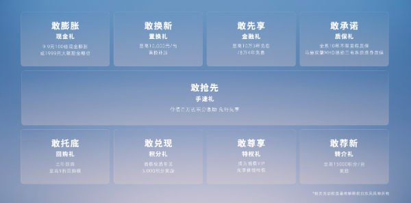 皓极预售直播当晚,包括“每台至高1万元置换补贴、10年不限里程质保”“马赫双擎MHD混动系统三电系统终身质保”“三年保值回购、回购额至高90%”“价值百万积分奖励”在内的九项权益“皓”礼随之公布。其中,“至高10万3年免息贷款或8万4年免息贷款”一权益尤为抢眼,皓极此举进一步降低了用户的购车门槛。