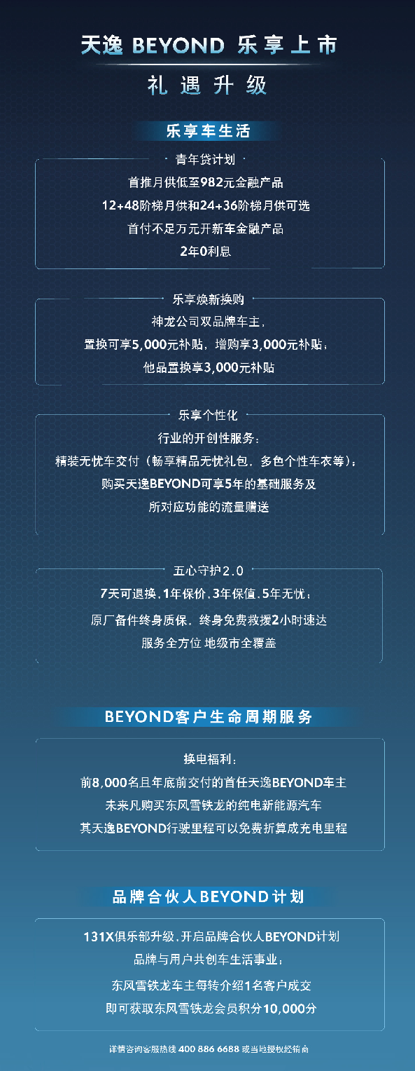 即日起客户可通过东风雪铁龙超级APP和 “东风雪铁龙 因你不同”小程序一键下定,享天逸BEYOND“青年贷计划、乐享焕新换购、乐享个性化、五心守护2.0”的上市礼遇。
