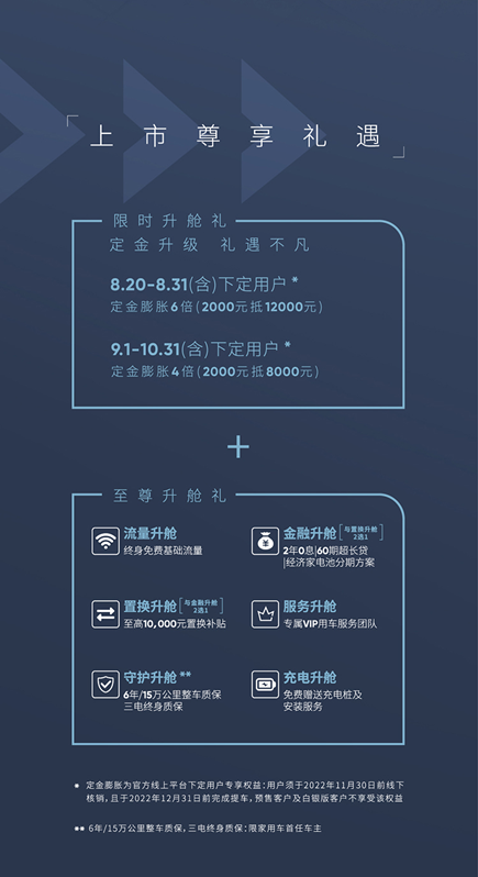 自上市之日起至2022年10月31日,通过上汽荣威APP、上汽荣威官方抖音平台下定,用户即可享受“限时升舱礼”。8月20日-8月31日(含)下定,可享2,000元抵12,000元购车款;9月1日-10月31日(含)下定,可享2,000元抵8,000元购车款。此外,荣威为用户准备了“至尊升舱礼”,包含流量、金融、置换、服务、守护、充电六重升舱礼遇。