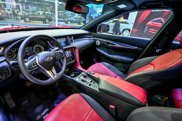 全新英菲尼迪QX55内饰采用红黑、黑灰两种配色方案;皮革覆盖的仪表台区域、摩纳哥红色的半苯胺真皮座椅、开放漆实木饰板等考究细节,彰显“魅力感”;充足的前排和后备箱空间、支持6:4放倒并可前后调节的后排座椅等,赋予空间“灵动感”;内置后备箱双按键等功能为整车加持“自如感”,以及ANC优化、前排隔音玻璃带来“静谧感”。
