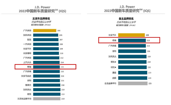 图为《2022中国新车质量研究报告》奇瑞排名(来自J.D. Power官网)