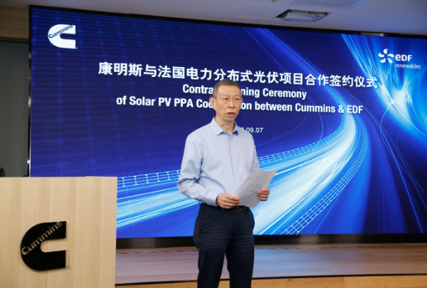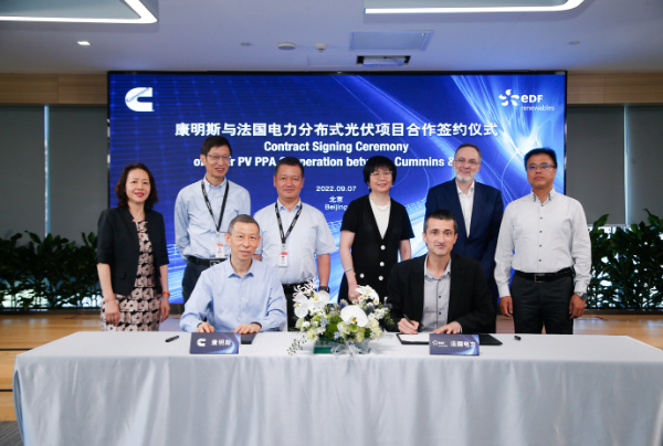 9月7日,康明斯中国与法国电力新能源在北京签署分布式光伏能源采购合同,旨在减少传统电网的用电量,降低生产运营中的碳排放。康明斯将提供运营厂房屋顶及部分空地并消纳太阳能电力,法国电力新能源将负责分布式光伏发电设备的投资、安装及运营。康明斯副总裁王宁,法国电力新能源中国首席执行官Erwann Debos代表双方完成签约。