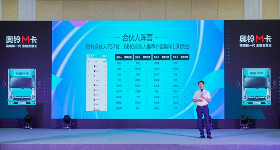 本次活动上,奥铃营销公司常务副总经理张春来为南方区域奥铃M卡首批合伙人授牌,并解读了合伙人政策。据了解,目前奥铃M卡合伙人阵营已有用户757位,其中68位合伙人推荐介绍购车130余台。