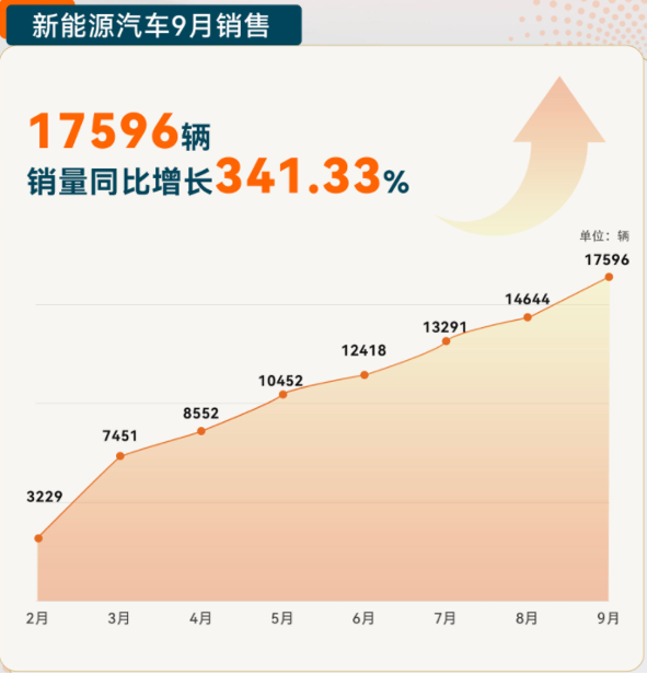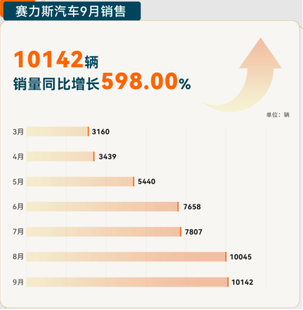10月9日,赛力斯集团股份有限公司(以下简称“赛力斯”)发布9月产销快报,赛力斯集团9月新能源汽车销量达17,596辆,同比增长341.33%;其中,赛力斯汽车9月销量为10,142辆,同比增长598.00%,再创新高。