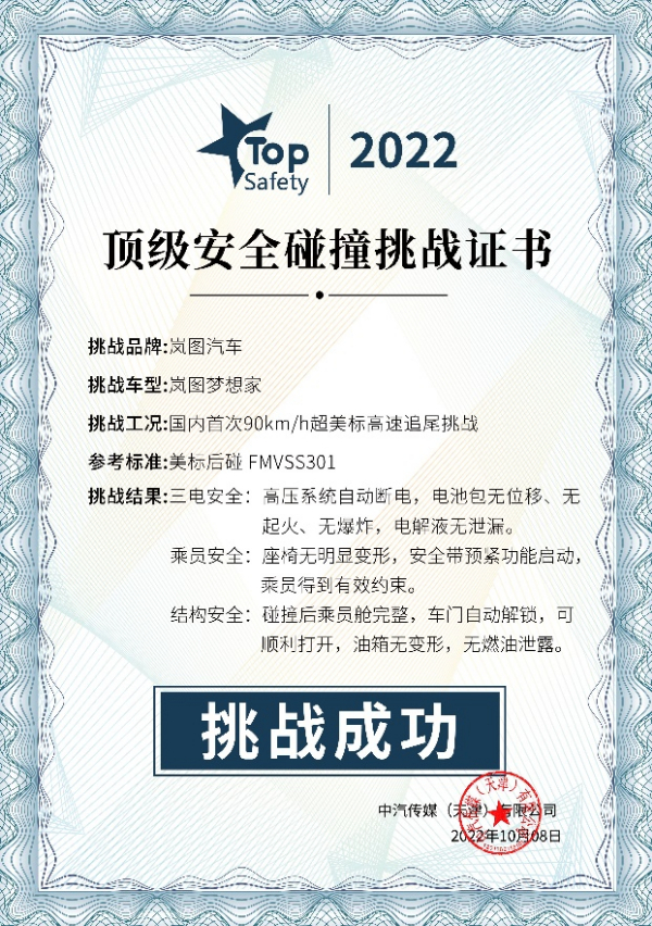 经评估满足所有评价标准,顺利通过包括车门开启、无燃油泄漏、安全带预紧点爆、触电保护性能符合标准等项目,取得全优成绩并获得“TOP Safety 2022顶级安全碰撞挑战证书”,挑战结果如下: