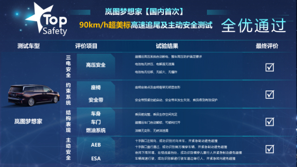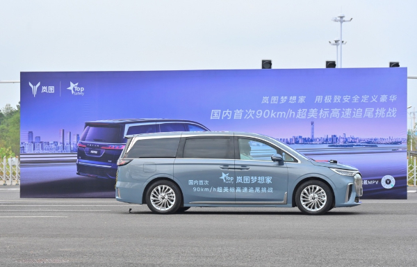 10月8日,“岚图梦想家 用极致安全定义豪华——主被动安全挑战”在长沙完成。在本次挑战中,岚图梦想家顺利完成90km/h超美标高速追尾测试、复杂场景极智AEB+ESA测试,两项测试均挑战成功。