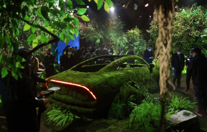 “源生”空间营造丛林之境,勃勃生机勾勒出VISION EQXX概念车研发过程中,设计团队从自然中所汲取的灵感与对于自然材料的创新运用。