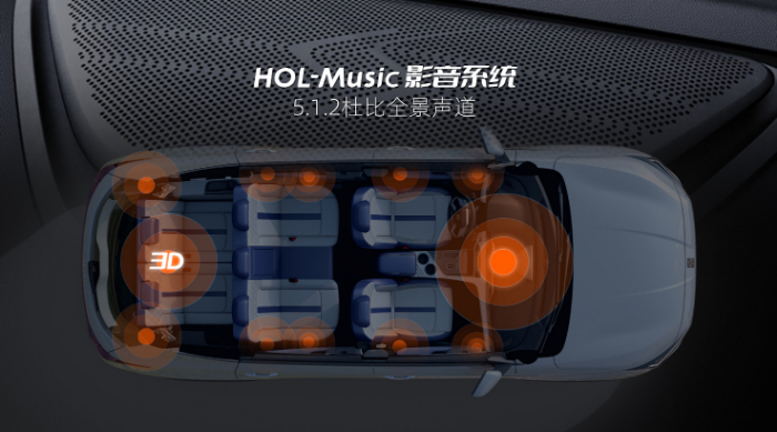 思皓X8 PLUS采用HOL-Music智能音乐系统,搭载12颗高保真扬声器,实现5.1.2杜比全景声道,并通过专座音效优化、大面积软包、64色氛围灯等设计,让爱车秒变移动音乐厅。