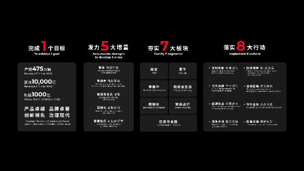 “1”代表1个目标,到2030年,广汽集团要实现产销超475万辆、营收1万亿、利税1千亿,成为产品卓越、品牌卓著、创新领先、治理现代的世界一流科技企业;“5”代表发力5大增量,包括整车转型升极、零部件强链延链、能源及生态赋能、国际化勇毅前行、智慧出行商业化运营;“7”代表夯实7大板块,包括研发、整车、零部件、能源及生态、国际化、智慧出行、投资与金融;“8”代表落实8大行动,要着力深化体制机制改革、科技创新研-投并重、自主品牌全力提升、强链延链优化结构、能源生态全面发力、软件业务深度布局、海外市场重点突破、智慧交通模式创新。