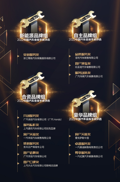 经过报名初审、线上投票及评委会综合评审,共有13个优秀汽车企业及品牌最终分别在新能源品牌组、自主品牌组、合资品牌组及豪华品牌组获得2022(第十七届)中国汽车金扳手奖。