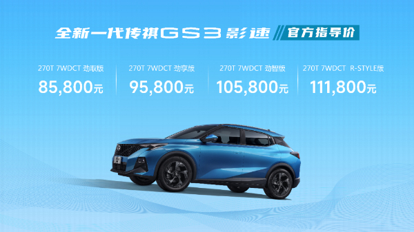3月8日,全新一代传祺GS3·影速正式上市。共推出4款配置,官方售价8.58万元-11.18万元。