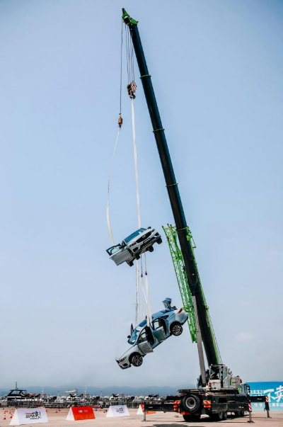 在“稳”招——钢铁威亚挑战中,首先测量了静止状态下星瑞车门3个点位的间隙数据,分别是3.4mm,3.5mm,3.4mm。挑战时,星瑞一侧B柱与吊车相连,并通过前后车悬架悬挂另一台星瑞,与吊车相连端B柱承重3T,最后悬吊车辆进行摆动测试。挑战后再次测量星瑞3个点位的数据是3.4mm,3.6mm,3.5mm,经过对比,悬吊前后只有0.1mm的微小变化,挑战成功。