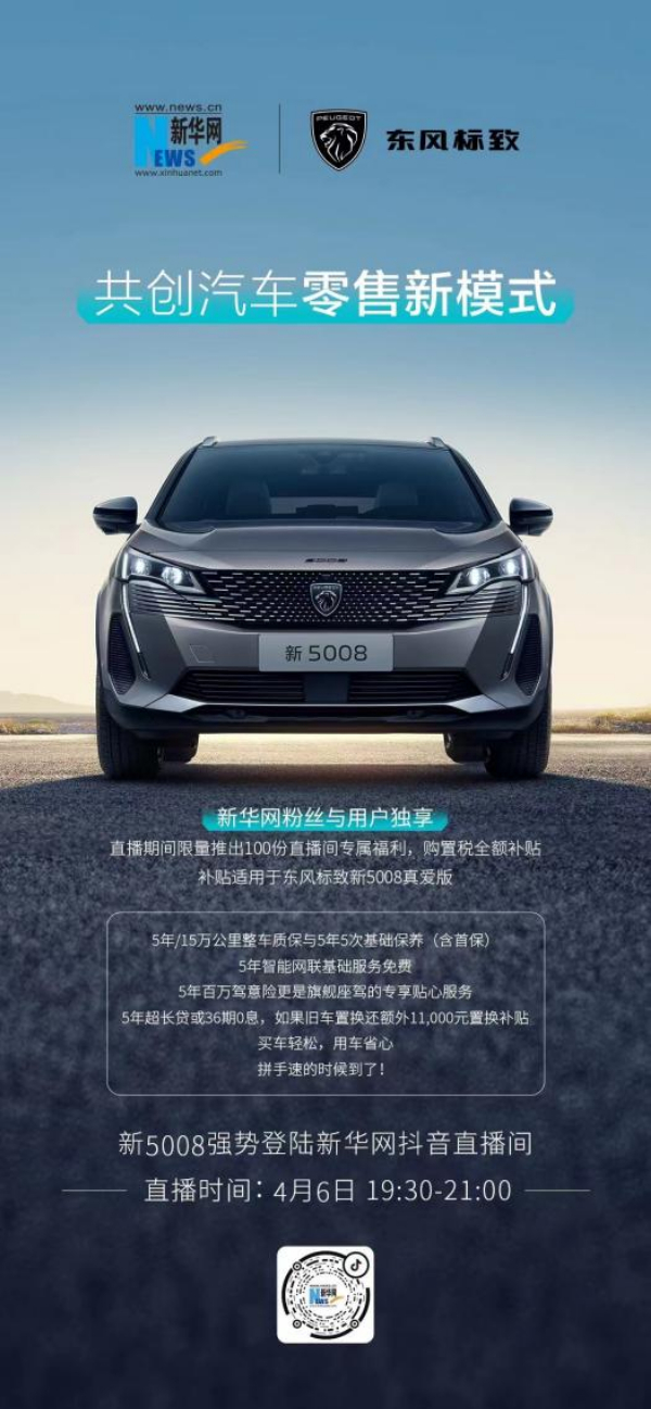 新华网联合东风标致共创汽车零售业态新模式。4月6日,东风标致新5008将登陆新华网抖音直播间,在直播期间还将送出限时、限量专享神秘重磅礼遇,助力广大用户轻松拥有旗舰品质的“总统座驾”!