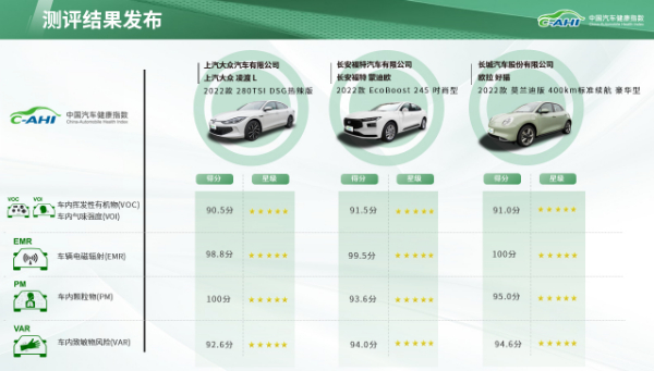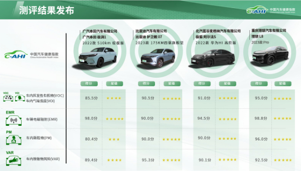 C-AHI中国汽车健康指数2023年第一批次测评结果共包含7款车型,发布包含了车内挥发性有机化合物与车内气味强度(VOC&VOI)、车辆电磁辐射(EMR)、车内颗粒物(PM)、车内致敏风险(VAR)四个板块的测评结果。7款车型分别是比亚迪护卫舰07(2023款175KM四驱旗舰型)、极狐阿尔法S(2022款华为HI高阶版)、理想L8(2023款Pro)、上汽大众凌度L(2022款280TSIDSG热辣版)、长安福特蒙迪欧(2022款EcoBoost245时尚型)、欧拉好猫(2022款莫兰迪版400KM标准续航豪华型)、广汽本田极湃1(2022款510KM绽极款)。其中,广汽本田极湃1(2022款510KM绽极款)在车内颗粒物(PM)测评板块获得三星成绩,在车内挥发性有机化合物与车内气味强度(VOC&VOI)以及车内致敏风险(VAR)板块获得四星成绩,在车辆电磁辐射板块(EMR)则获得五星成绩,其余6款车型在各测评板块均获得五星成绩。