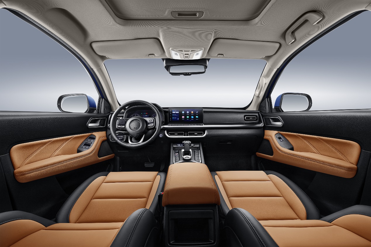 新车前脸全面焕新,大面积V型网状矩阵式中网,大气时尚。内饰全面升级,采用智慧悬浮屏设计,搭载12.3英寸智联大屏,大面积软质材料包覆;更有无钥匙进入、一键启动、自动驻车、电动天窗、自动大灯等智能装备。