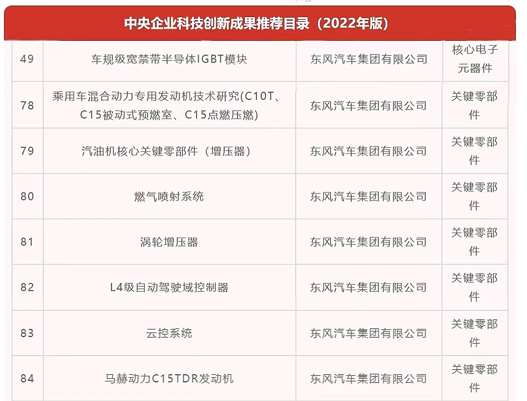 手册由国务院国资委科技创新局组织开展,经企业报送与专家评审并发布,旨在加快中央企业科技创新成果应用推广,促进科技成果向现实生产力转化。本次共涉及核心电子元器件、关键零部件、分析测试仪器、基础软件、关键材料、先进工艺、高端装备七个领域,共收录科技创新成果产品369项。东风公司上榜的八大创新成果包含核心电子元器件:车规级宽禁带半导体IGBT模块,以及关键零部件:乘用车混合动力专用发动机技术研究(C10T、C15被动式预燃室、C15点燃压燃)、汽油机核心关键零部件(增压器)、燃气喷射系统、涡轮增压器、L4级自动驾驶域控制器、云控系统、马赫动力C15TDR发动机,证明东风公司在半导体、动力及自动驾驶等领域都取得了不俗的创新成果。