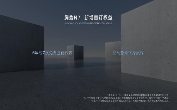 为了给腾势N7的首批用户们带来更多福利,在四大豪华专属权益基础上,腾势N7新增部分盲订权益——即日起下订腾势N7将获得价值6000元6年或7次免费基础保养,以及空气悬架终身质保。赵长江也在现场公布了腾势N7的产品节奏,6月中旬可前往门店实车体验、下旬上市大定,7-8月正式开启N7交付。