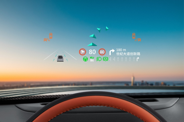 我们看到,深蓝S7前方的大屏如同“锦囊”,集丰富功能于一身,其AR-HUD全新增程现实系统可通过智能驾驶与车载系统的深度融合,准确将包括车速、续航里程、高频使用的指示灯等2D呈现常显信息以及包括AR导航箭头、实时路口指引等3D呈现动态信息呈现在大屏中,以动态+静态的形式将车内、车外信息全面投放于大屏之上。对于夜晚、阴天、晴天等不同亮度,AR-HUD大屏还可进行自适应调节。
