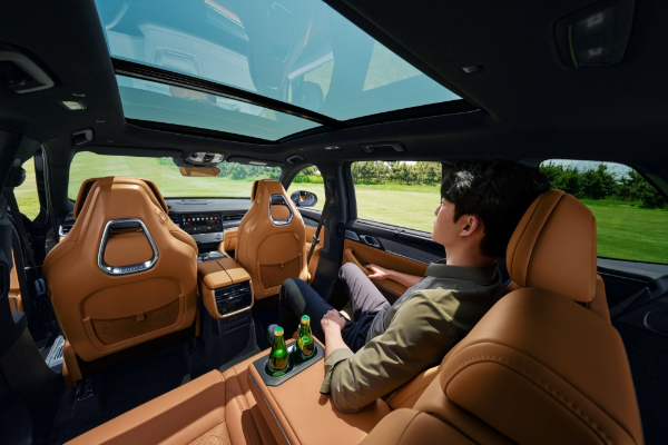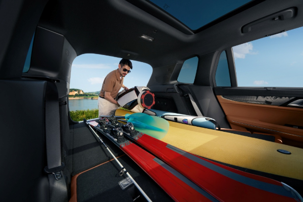 旗舰的体量从二排延伸至车尾。领克09首款五座车型拥有691L超大容积后备厢,在二排座椅放倒状态下,最大可扩容至1522L、最大纵深达2075mm,露营帐篷、钓鱼杆、冲浪板、高尔夫球包等户外装备统统轻松装下,充分满足每一位用户的需求。