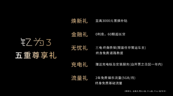 上市专属权益:惊喜的价格之外,钇为3还为用户准备了五重上市好礼:至高3000元的置换补贴;0利息或60期超长贷;三电终身质保、终身免费道路救援;充电桩及安装服务;终身免费基础流量以及2年免费娱乐流量(5GB/月)。