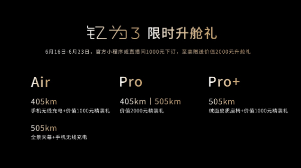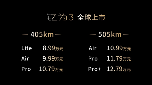 405km Lite版 8.99万元;Air版 9.99万元;Pro版 10.79万元
