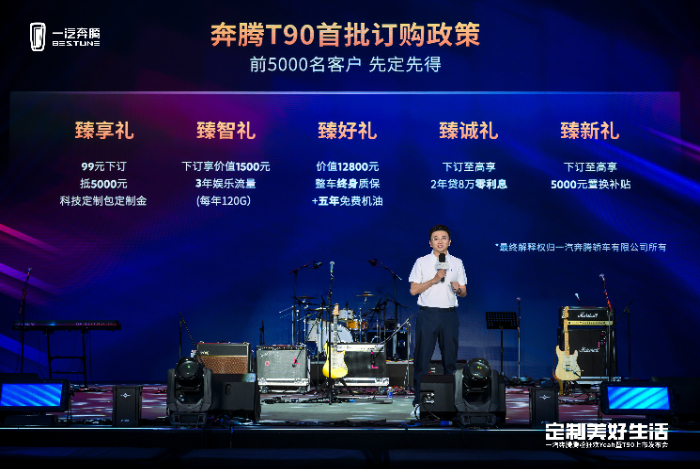 火爆的音乐狂欢之外,奔腾T90前5000名购车用户还可享受五大上市权益。除了99元下订抵5000元科技定制包定制金、价值1500元3年娱乐流量、至高享两年贷 8 万零利息、至高5000元置换补贴,奔腾T90用户还可尊享价值12800元整车终身质保加五年免费机油,贴心护航更长久。同时,6月30日前,通过京东“一汽奔腾汽车官方旗舰店”平台,0 元预订奔腾T90可抽万元购车券,1元下订享 2000 元购车券。粉丝看直播还能抽奔腾T90一年使用权,购置税、商业险限时减免也可叠加使用。