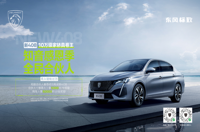 “知音感恩季 全民合伙人”活动主要聚焦消费群体最广的A+级轿车市场,参与活动的车型是有着“10万级A+品质标杆”之称的东风标致新408。作为一款“新法式高品质大家轿”,新408与同级传统燃油车型相比,颜值靓、空间大、安全环保空气质量优、动力操控强、客户体验佳、价格竞争力强,为消费者带来越级享受、时尚个性、澎湃高效的用车体验。