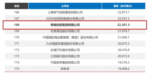 近日,《财富》中文网发布了2023年《财富》中国500强排行榜。奇瑞控股集团有限公司作为非上市企业首次申报参选,以223.015亿美元的营业收入,位居排行榜第168位。