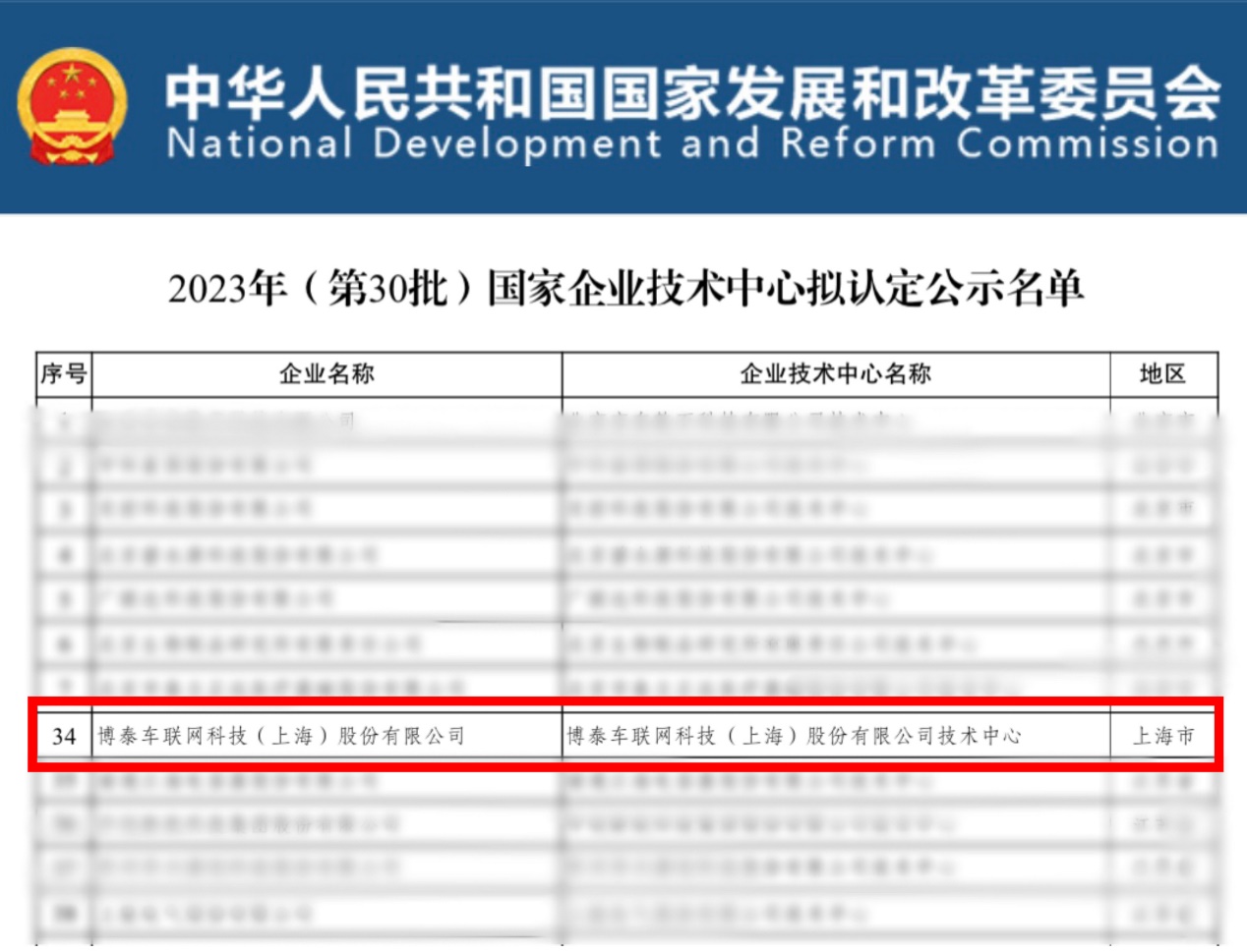 近日,国家发改委网站公布了2023年(第30批)国家企业技术中心拟认定公示名单,上海企业博泰车联网技术中心入选名单。国家企业技术中心是由国家发改委等部门授予的目前国内规格最高、影响力最大的技术创新平台之一,综合考评申报公司的创新人才、技术积累、创新平台、技术产出和创新效益等指标。
