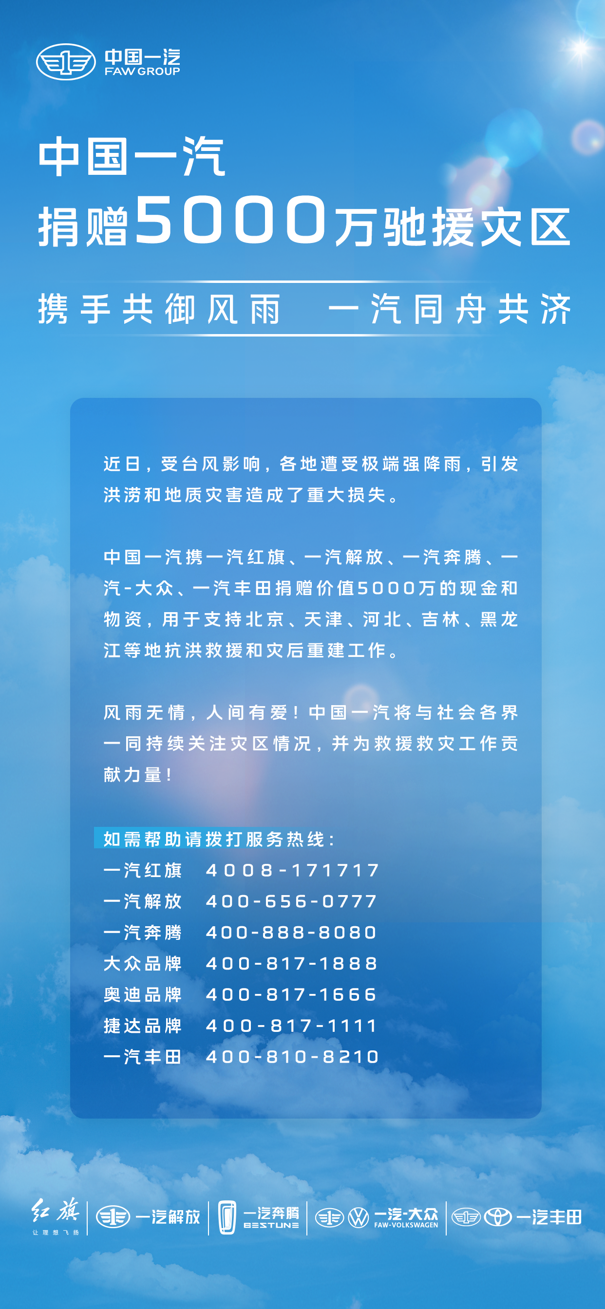 中国一汽坚守央企社会责任,携旗下一汽红旗、一汽解放、一汽奔腾、一汽-大众、一汽丰田捐赠价值5000万的现金和物资,用于支持北京、天津、河北、吉林、黑龙江等地抗洪救援和灾后重建工作。
