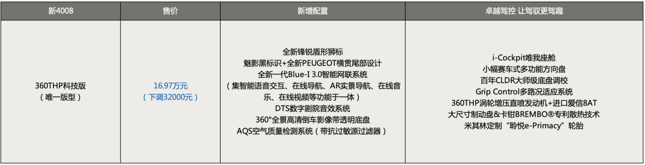 新4008科技版通过焕新狮标,展现运动个性颜值,同时科技配置升级全新一代Blue-i 3.0智能网联系统,可在线导航的同时,还有AR导航科技加持;倒车影像升级为360°全景高清倒车影像带透明底盘,新增AQS空气质量监测系统(带抗过敏源过滤器),让驾驶体验更智能、更健康、更安全。