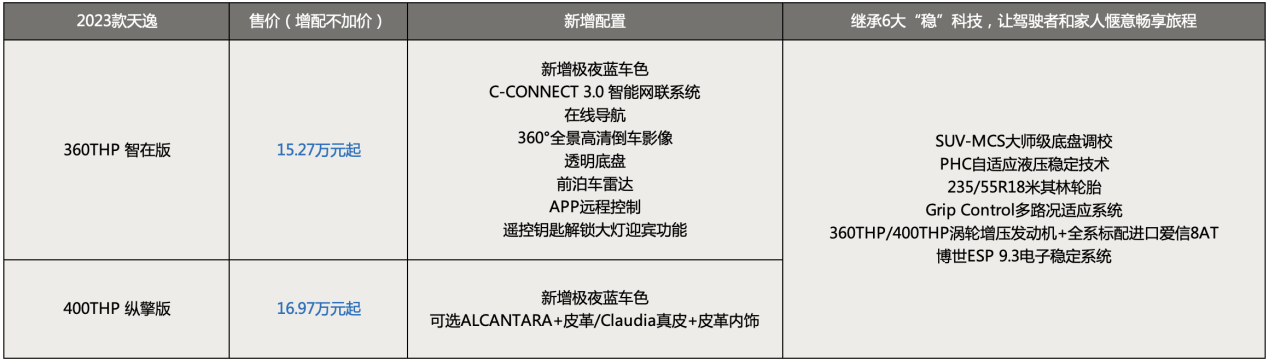 其中2023款天逸在传承品质、舒适等特征基础上,智能再升级。不仅首次推出其全新极夜蓝车色,还将360THP智在版的智能网联系统升级为C-CONNECT3.0,增加了在线导航、360°全景高清倒车影像、透明底盘、前泊车雷达、APP远程控制、遥控钥匙解锁大灯迎宾等功能,带来科技与便利兼具的出行体验。