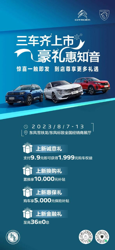 值得一提的是,2023年8月7日-8月13日,东风雪铁龙、东风标致还推出了“三车齐上市,豪礼惠知音”礼遇,包括支付9.9元即可获得1999元购车权益、置换享10000元补贴、购车享5000元保险补贴、至高36期0息,以更好地满足客户需求并主动应对市场,用真金白银实力宠粉。