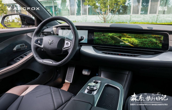 极狐,一个亲近自然且极具灵性的名字,笔者当日所驾驶的阿尔法T森林版很好地呈现出其名字背后的寓意与场景。当日所驾驶车辆的颜色为雾云灰色,是那种绿中带灰的颜色,给第一眼看到它的人带去一种沉稳的清新感。进入车内,前方的大平台如在车前铺开一张绿布,平台呈淡绿色,比车身颜色要亮一些,这样的设计给人一种舒适畅快的感觉。