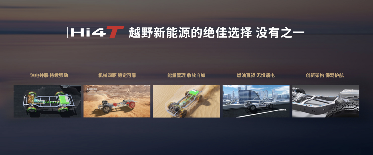 Hi4-T是越野新能源时代的最佳选择,由长城集团基于坦克平台打造,采用纵置并联混动架构,具有可持续的强动力输出、精准化智慧能量管理、可靠耐用的四驱系统、安全可靠创新架构等特征,让越野“要劲儿有劲儿、要电有电、要省能省”,做到全工况从容驾驭。