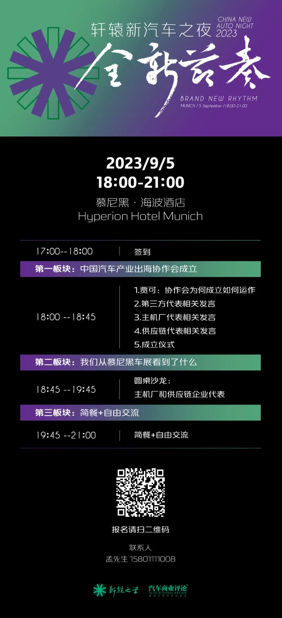 2023年9月5日,慕尼黑国际车展(IAA Mobility)将在德国慕尼黑市中心和慕尼黑展览中心(Messe München)开幕。当天晚上,轩辕之学联合汽车商业评论将要举行CHINA NEW AUTO NIGHT 2023。