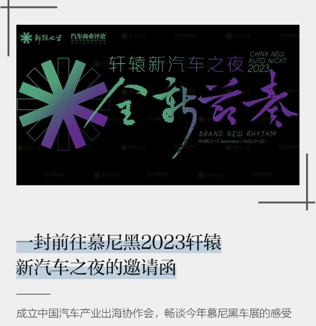 汽车商业评论诚挚邀请您9月5日傍晚参加在德国慕尼黑车展期间举行的2023轩辕新汽车之夜(CHINA NEWAUTO NIGHT 2023),探讨如何助力中国汽车产业国际化。