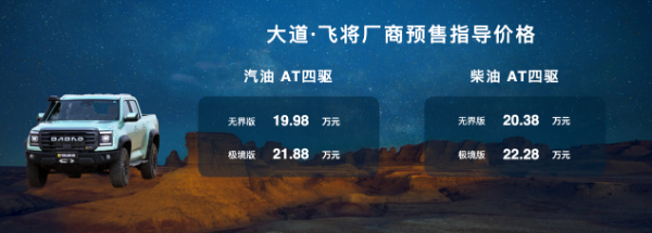 大道·飞将同步开启预售,配备柴汽油 AT 四驱,四款车型,厂商预售指导价格分别为: 飞将汽油无界版 19.98 万元,飞将汽油极境版 21.88 万元;飞将柴油无界版 20.38 万元,飞将柴油 极境版 22.28 万元。